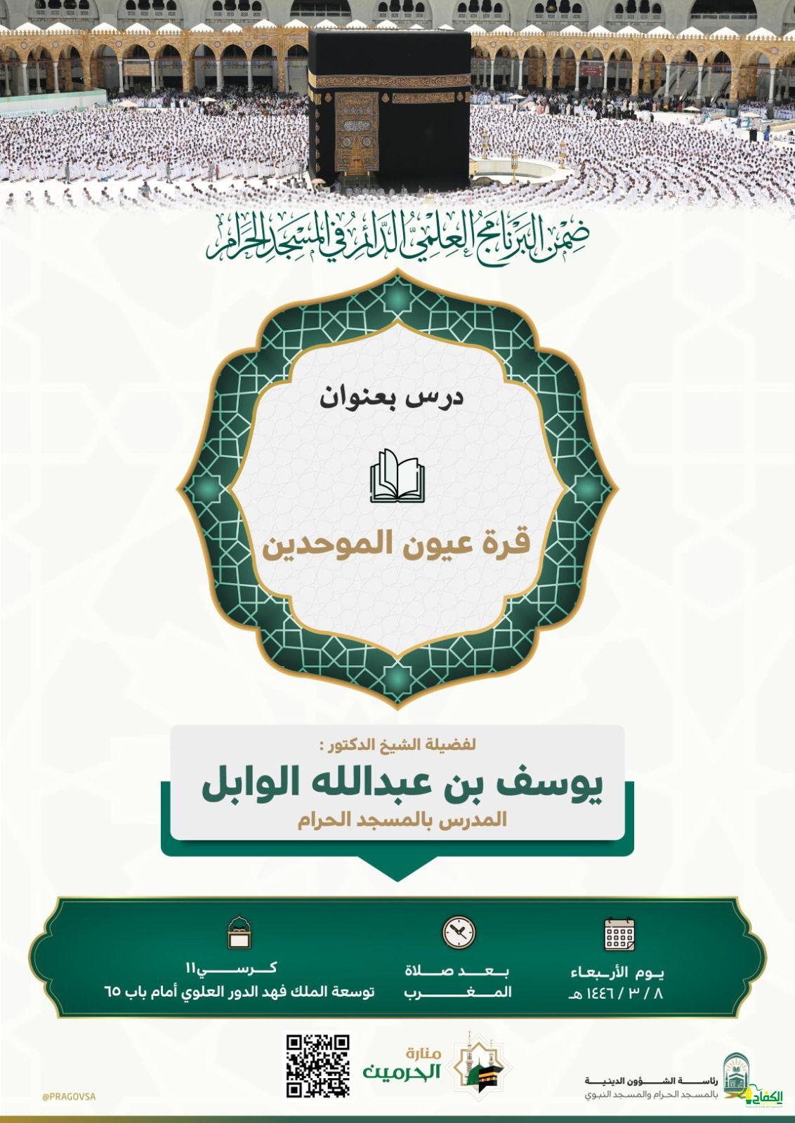 ضِمن البرنامج العلمي الدائم في المسجد الحرام تدعوكم رئاسة الشؤون الدينية بالمسجد الحرام والمسجد النبوي لحضور درس بعنوان: قرة عيون الموحدين لفضيلة الشيخ الدكتور يوسف بن عبدالله الوابل المدرس بالمسجد الحرام أقيمت أمس الاربعاء ٨-٣-١٤٤٦هـ بعد صلاة المغرب في كرسي رقم (١١ ) بتوسعة الملك فهد الدور العلوي أمام باب ٦٥