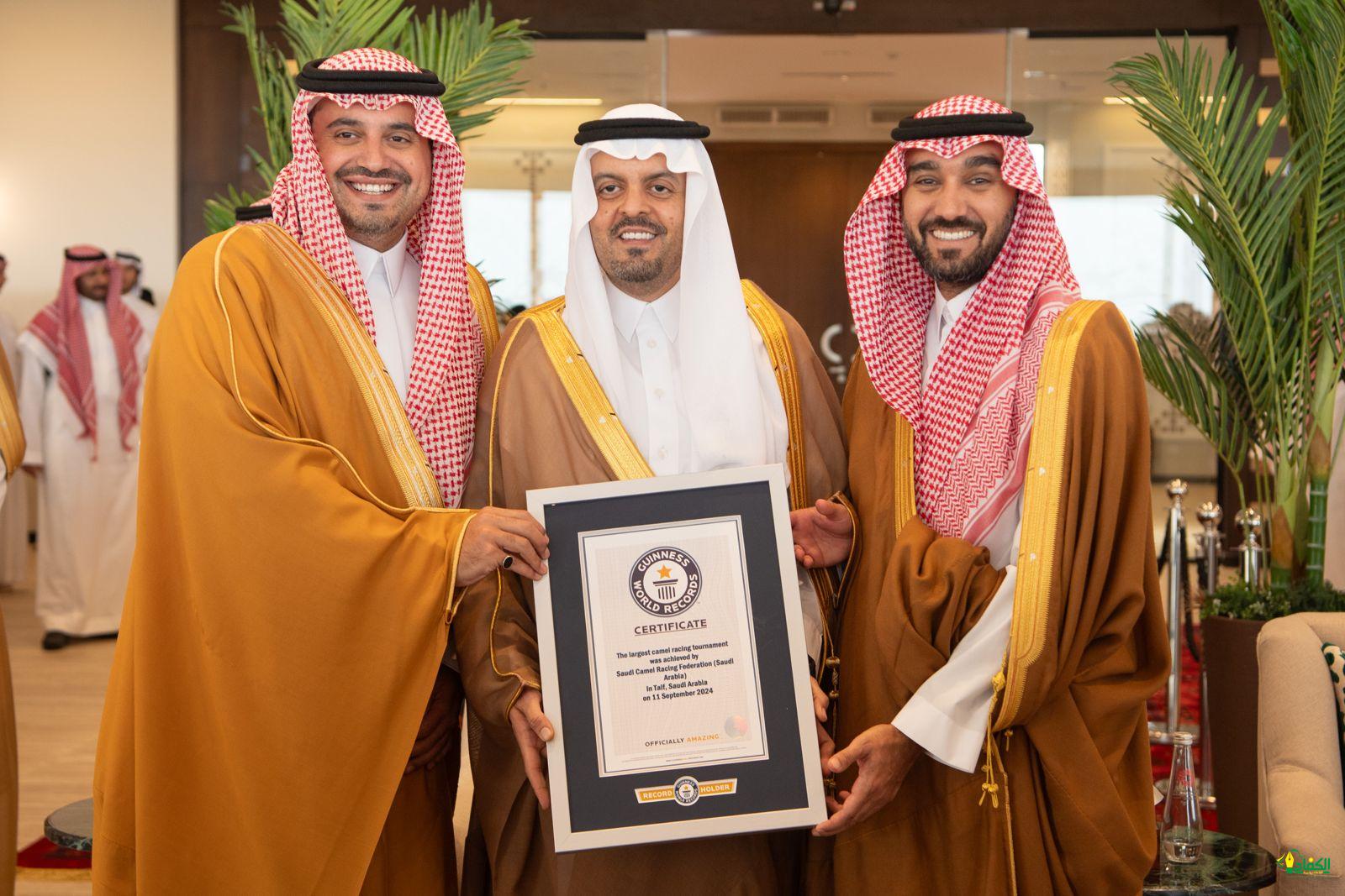 بحضور صاحب السمو الملكي الأمير سعود بن مشعل بن عبد العزيز آل سعود نائب أمير منطقة مكة المكرمة، وصاحب السمو الملكي الأمير عبد العزيز بن تركي الفيصل، وزير الرياضة رئيس اللجنة الأولمبية والبارالمبية السعودية، تسلمت اللجنة العليا المنظمة لمهرجان ولي العهد للهجن، شهادة موسوعة “جينيس” للأرقام القياسية، كأكبر مهرجان لرياضة الهجن في العالم، وذلك بتسجيله أكبر عدد مطايا مشاركة في سباقات الهجن.