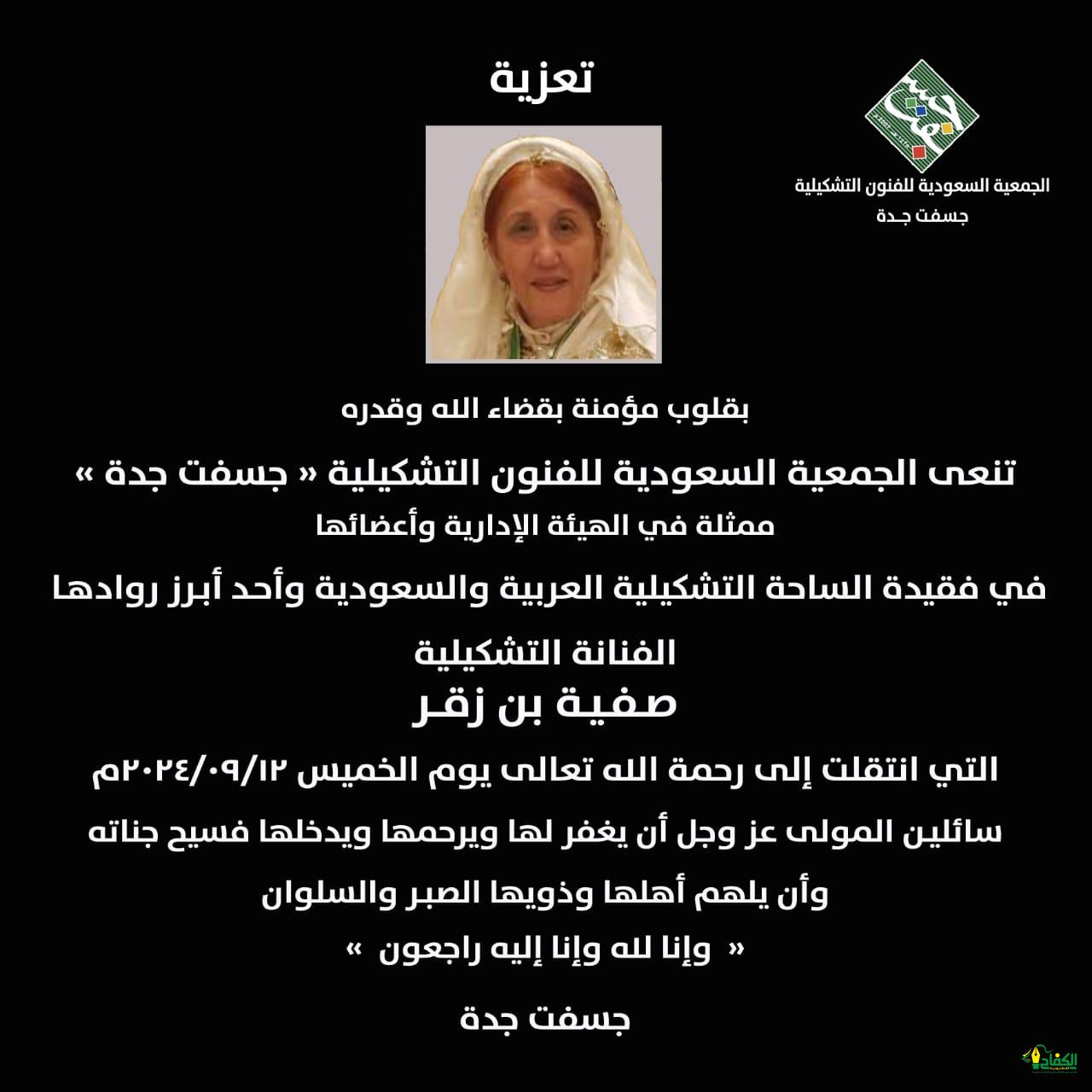 رحلت مساء أمس رائدة الفن التشكيلي السعودي الفنانة الشهيرة القديرة صفية بن زقر، والتي وافتها المنية بعد مسيرة تشكيلية حافلة وضعت فيها بصمتها المضيئة بالإبداع في مشهدنا الثقافي والفني.