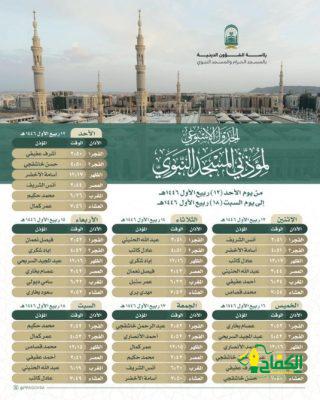 اما في المسجد النبوي الشريف يؤم المصلين في صلاة الفجر فضيلة الشيخ أحمد بن حميد وصلاة الظهر فضيلة الشيخ الدكتور عبدالمحسن القاسم وصلاة العصر فضيلة الشيخ الدكتور علي الحذيفي وصلاة المغرب فضيلة الشيخ الدكتور خالد المهنا وصلاة العشاء فضيلة الشيخ الدكتور أحمد الحذيفي كما اعتمدت جدول المؤذنين الأسبوعي بالمسجد الحرام والمسجد النبوي.