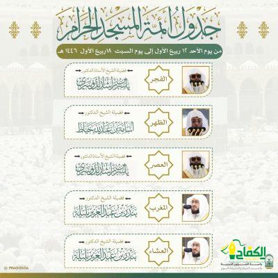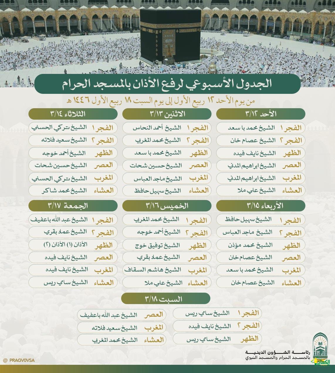 أعتمدت رئاسة الشؤون الدينية بالمسجد الحرام والمسجد النبوي ‘ الجدول الأسبوعي لأئمة المسجد الحرام والمسجد النبوي اعتبارًا من اليوم الاحد الموافق ١٤٤٦/٣/١٢ حتي يوم السبت القادم ١٤٤٦/٣/١٨ في المسجد الحرام حيث يؤم المصلين في صلاة الفجر فضيلة الشيخ الأستاذ الدكتور ياسر الدوسري وصلاة الظهر فضيلة الشيخ أسامة خياط وصلاة العصر فضيلة الشيخ الأستاذ الدكتور ياسر الدوسري وصلاة المغرب والعشاء فضيلة الشيخ الدكتور بندر بليلة.