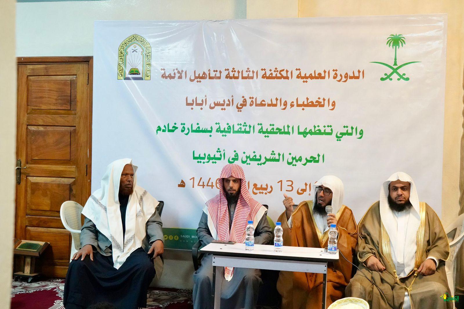 اختتمت وزارة الشؤون الإسلامية والدعوة والإرشاد، ممثلة بالملحقية الدينية بسفارة المملكة في إثيوبيا، اليوم، الدورة العلمية الثالثة لتأهيل الأئمة والخطباء والدعاة، والتي استمرت أربعة أيام واستفاد منها أكثر من 1500 مستفيدا.. حيث تضمنت “شرح كتاب التوحيد، وشرح العقيدة الواسطية، وشرح أصول أهل السنة والجماعة للإمام أحمد”.