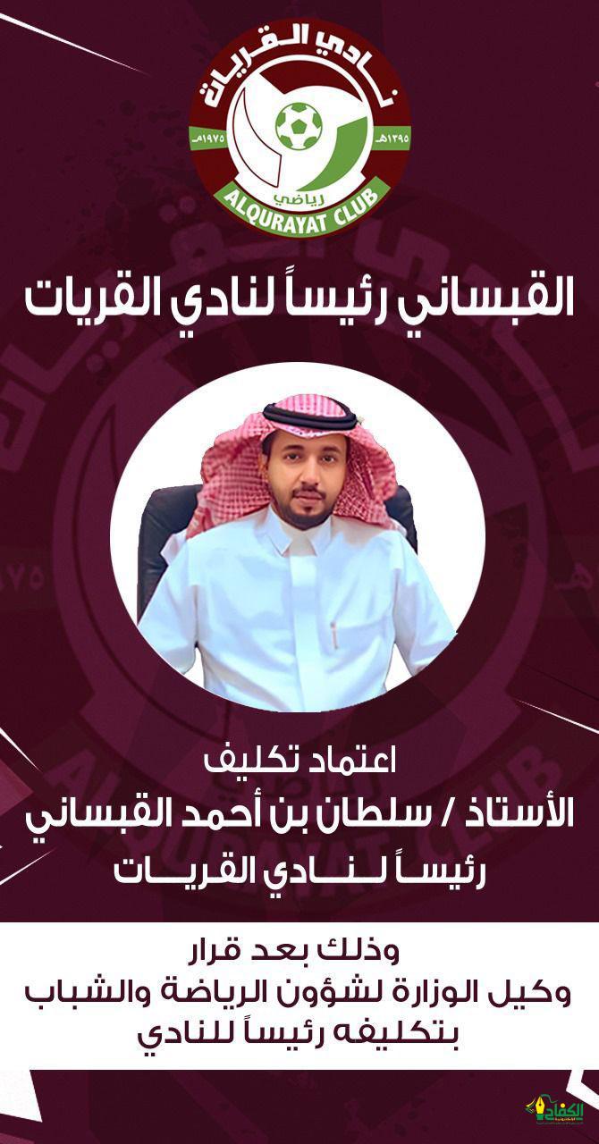 اعتمد سعادة وكيل وزارة الرياضة لشؤون الرياضة والشباب الأستاذ عبد العزيز بن عبدالرحمن المسعد، تكليف الأستاذ سلطان بن أحمد القبساني رئيساً لمجلس إدارة نادي القريات ، متمنين له داوم التوفيق والنجاح وتحقيق آمال وتطلعات جماهير ومحبي النادي.