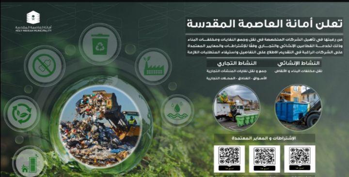 دعت أمانة العاصمة المقدسة الشركات المتخصصة في مجال نقل وجمع النفايات ومخلفات البناء إلى تقديم طلبات التأهيل، وذلك لخدمة القطاعين الإنشائي والتجاري وفقًا للاشتراطات والمعايير المعتمدة، بهدف الارتقاء بالخدمات المقدمة وضمان كفاءة أعمال النظافة.