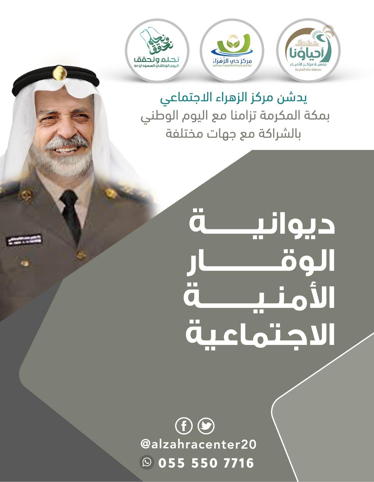 ديوانية الوقار الأمنية الاجتماعية بيوم الوطن المجيد يدشنها مركز الزهراء الاجتماعي بمكة المكرمة بأحياؤنا وبكل الأقسام الأمنية والأندية الرياضية تحتضنها محاضن التعليم ومناشطها بشكل دوري تقام ( ستكون فقرة في احتفال مركز الزهراء الاجتماعي بمنطقة الزهراء بمكة بالديوانية) ونهدف بها تكريم أهل الوقار الأمنيين الذي أبلو بلاء حسنا في حفظ واستتباب الأمن تحت قيادتنا الرشيدة واعطوا بلا حدود ونجمع بها الأجيال الثلاثة الماضي والحاضر والمستقبل ونساهم بمناشطها كافة شرائح المجتمع.