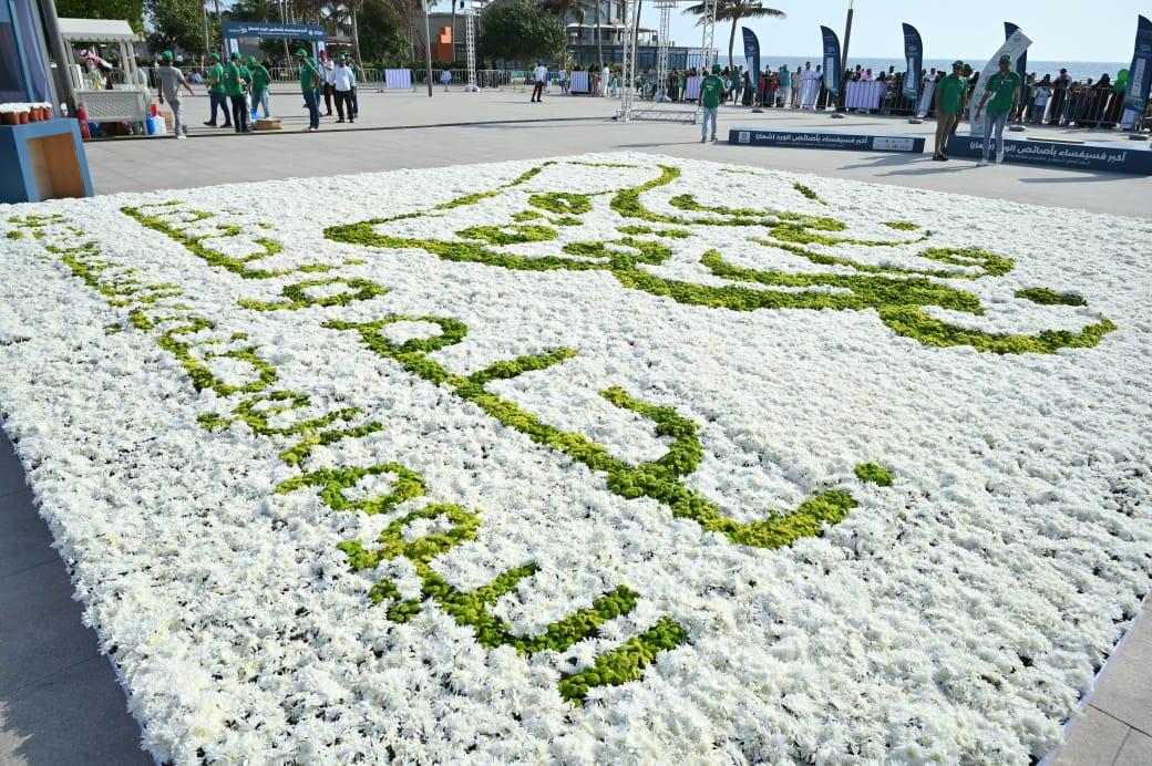 وتتربع الفسيفساء على مساحة 94 مترًا مربعًا تشتمل على 5600 من الأصائص لتشكل لوحة جمالية تتزامن مع احتفالات المملكة بيومها الوطني، حيث حصلت على شهادة جينيس للأرقام القياسية.