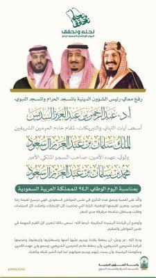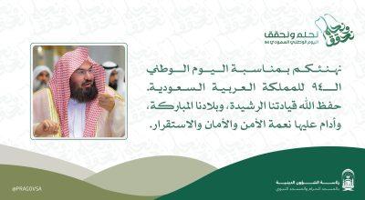 رفع معالي رئيس الشؤون الدينية بالمسجد الحرام والمسجد النبوي، الشيخ الأستاذ الدكتور: عبد الرحمن السديس، أسمى آيات التهاني والتبريكات لمقام خادم الحرمين الشريفين، الملك سلمان بن عبد العزيز، ولولي عهده الأمين ؛ بمناسبة اليوم الوطني الـ ٩٤ للمملكة العربية السعودية مؤكدا أن قيادتنا الرشيدة الحكيمة – أيدها الله تسعى دائمًا لتعزيز كل القيم المهمة في نفس المواطن؛ مؤكدا ان المملكة العربية السعودية نجحت بامتياز في تكريس قيم الوسطية في العالم.