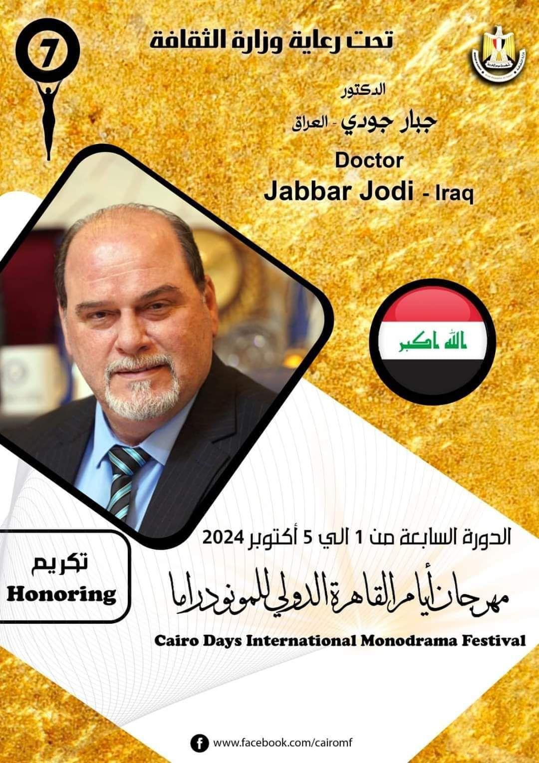 ضمن كوكبة المكرمين في مهرجان ايام القاهرة الدولي للموندراما بنسخته السابعة يتوهج اسم الدكتور جبار جودي مدير عام دائرة السينما والمسرح نقيب الفنانين العراقيين ومن المقرر ان يقام المهرجان في الفترة من ١ ١لى ٥ اكتوبر المقبل في القاهرة.