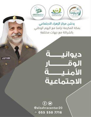 وتم تدشين ديوانية الوقار الأمنية الإجتماعية بمنطقة الزهراء تم التعريف بها ومحاورة اهل الوقار الأمنيين وتكريمهم وهم : العم عبده عسيري العم معبر الجيزاني العم احمد المالكي وتعذر حضور الأغلب لظرف صحتهم وبأذن الله قريبا تتم زيارتهم ووزعت الهدايا التذكارية للحضور والمباشرة بالقهوة والتمور السعودية.