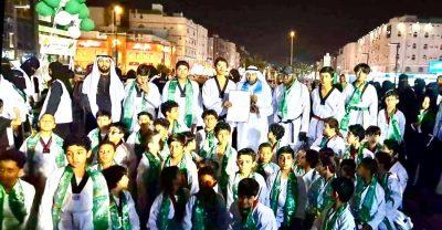 مع المساهمة بقصيدة شعرية أما فريق كشافة مكة، فقد أضفى حماسًا كبيرًا من خلال الصياحات الكشفية ورفع الأعلام في مسيرة وطنية، تجسدت فيها روح الولاء للوطن الغالي.