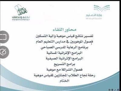 وتناول اللقاء تفسير نتائج مقياس موهبة وآلية تسكين الطلبة في فصول الموهوبين بمدارس التعليم العام، بالإضافة إلى برنامج رعاية البرامج الإثرائية المسائية، والبرامج الإثرائية الصيفية، وبرنامج التسريع، وفصول الشراكة مع موهبة يأتي ذلك حرصاً من الإدارة على أهمية التواصل مع الطلبة المجتازين لمقياس موهبة ٢٠٢٤ م.