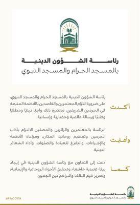 أكدت رئاسة الشؤون الدينية بالمسجد الحرام والمسجد النبوي، على ضرورة التزام المعتمرين والقاصدين بالأنظمة المتبعة في الحرمين الشريفين، معتبرة ذلك واجبًا دينيًا ومطلبًا وطنيًا ورسالة عالمية وحضارية وإنسانية.