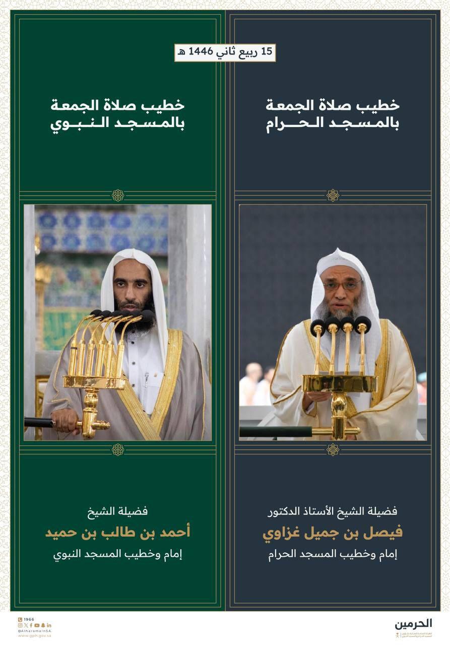 حددت رئاسة الشؤون الدينية بالمسجد الحرام والمسجد النبوي الشريف خطيبا يوم غد الجمعة الخامس عشر من شهر ربيع الثاني 1446هـ لصلاة الجمعة بالمسجد الحرام حيث سيكون خطيب الجمعة فضيلة الشيخ الأستاذ الدكتور فيصل بن جميل غزاوي – إمام وخطيب المسجد الحرام بينما سيكون خطيب الجمعة بالمسجد النبوي الشريف فضيلة الشيخ أحمد بن طالب بن حميد – إمام وخطيب المسجد النبوي الشريف.