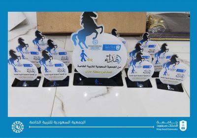 حيث ينوب عن المدير التنفيذي أ. احمد بن قاسم خرمي ( مسؤول الشراكات المجتمعية ) وبحضور عددا من أعضاء الجمعية حيث قاموا بتقديم الدروع التذكارية على جميع المشاركين من هواة ركوب الخيل من المكفوفين.