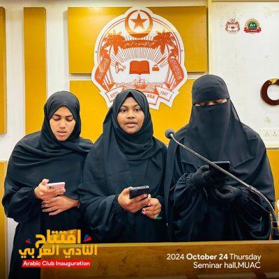 وترأس الدكتور عبدالرشيد عميد الكلية حفل افتتاح النادي العربي وتحدث خلال اللقاء كل من الدكتور بشير مانجيري والدكتور عبدالمنير مدني و الدكتور محمد بشير والدكتور افضل يم تي والدكتور سمير مون كما تم تدشين شعار النادي في هذا الحفل، وقدم عميد الكلية ذرعا تذكاريا للدكتور حسين أبو بكر مكتوبا بفن الخط العربي ( calligraphy ) والذي رسمته الطالبة سفرينة وفي نهاية اللقاء قام الدكتور حسين أبو بكر بتوزيع الشهادات للمتفوقين الذين شاركوا في البرامج الثقافي الذي عقدته جامعة كاليكوت الحكومية ببحوثهم. و أنشدت الطالبات فريق رفاء نشيدة ترحيبية للدكتور حسين مدوور و لسائر الحضور.
