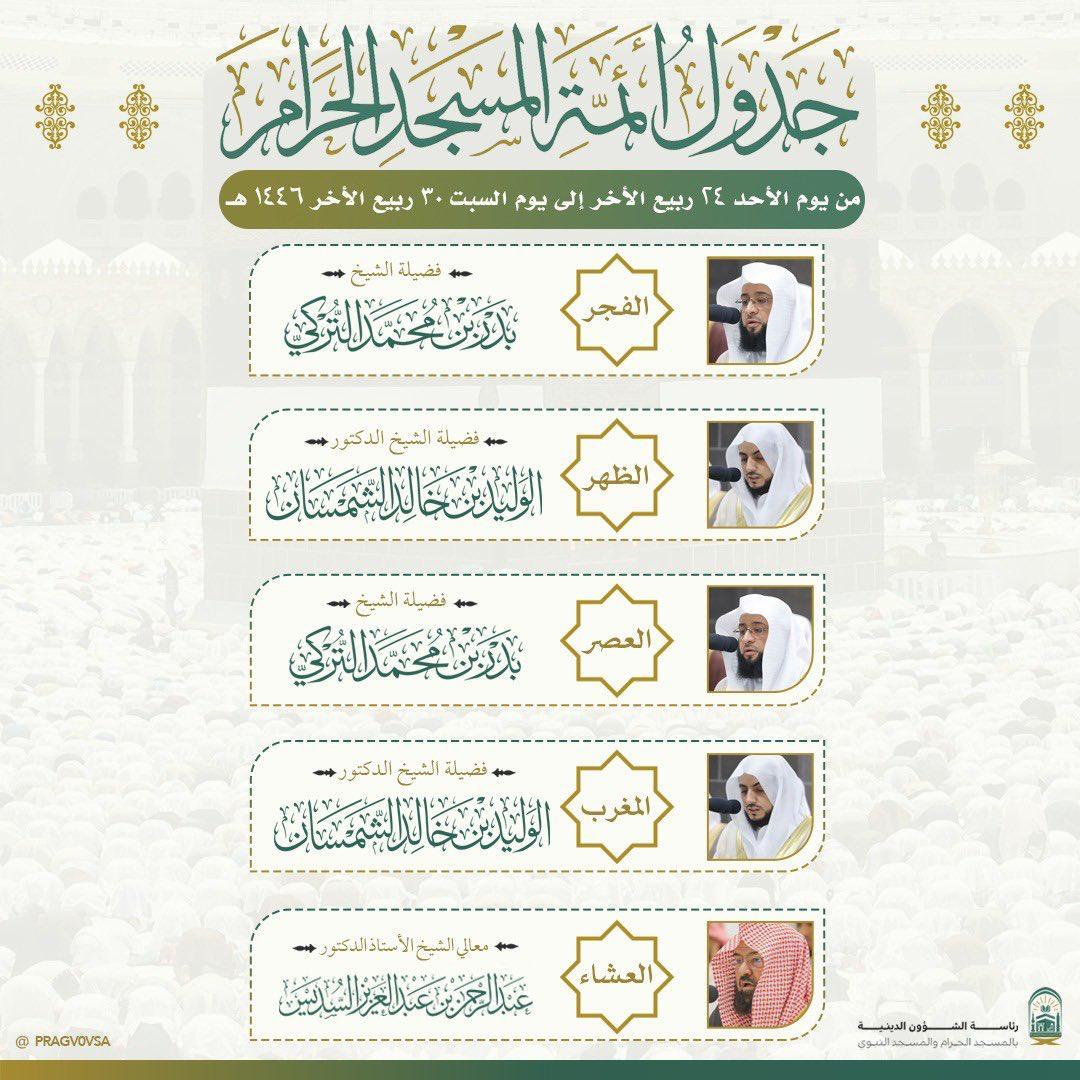أصدرت رئاسة الشؤون الدينية بالمسجد الحرام والمسجد النبوي جدول الأئمة الأسبوعي بالمسجد الحرام من يوم غد الأحد ٢٤ ربيع الآخر إلى يوم السبت ٣٠ ربيع الآخر ١٤٤٦هـ وجاء الجدول على النحو التالي : يؤم المصلين لصلاة الفجر والعصر فضيلة الشيخ بدر بن محمد التركي بينما يؤم المصلين لصلاة الظهر والمغرب فضيلة الشيخ الوليد بن خالد الشمسان ويؤمّ المصلين لصلاة العشاء معالي الأستاذ الدكتور عبدالرحمن بن عبدالعزيز السديس.