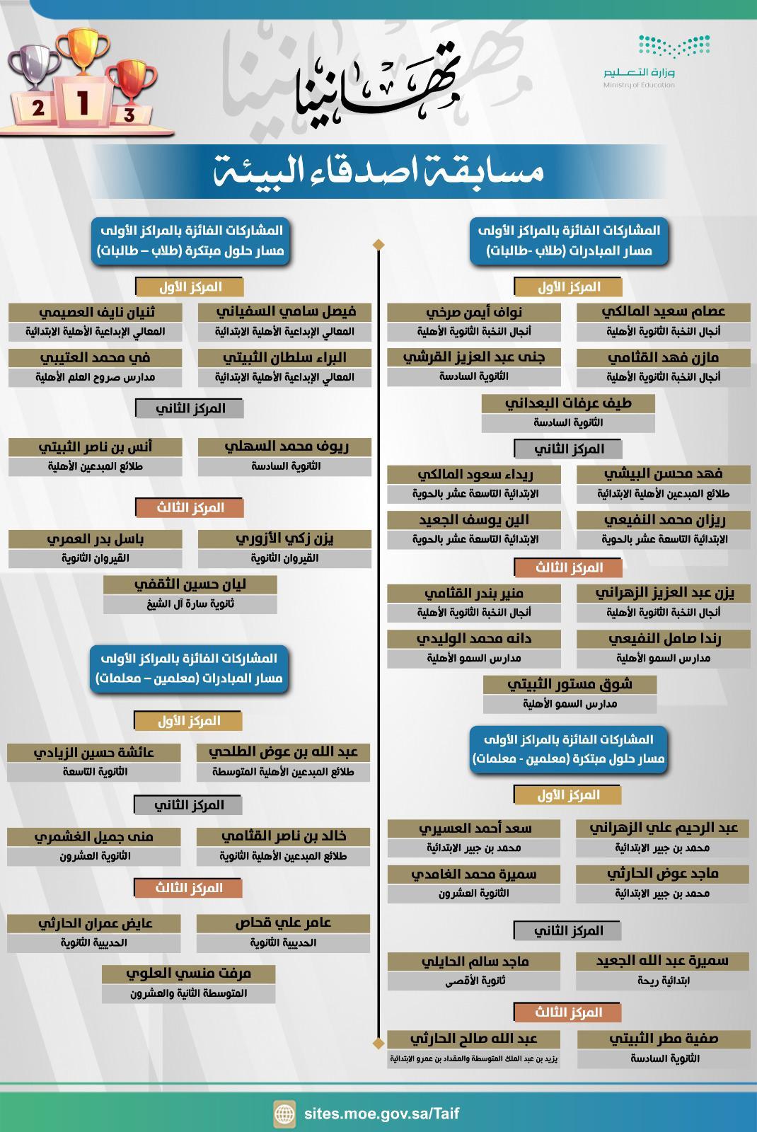 أوضحت الإدارة العامة للتعليم في الطائف نتائج مسابقة أصدقاء البيئة والتي تهدف الى اكساب الطلبة المفاهيم والمعارف المرتبطة بعلوم البيئة وغرس القيم والمبادئ السلوكية الصحيحة تجاه البيئة بما يحقق الاستدامة للبيئة تماشياً مع رؤية المملكة 2030م وتأتي هذه المسابقة ضمن فعاليات الاحتفاء باليوم الوطني 94 للمملكة العربية السعودية.