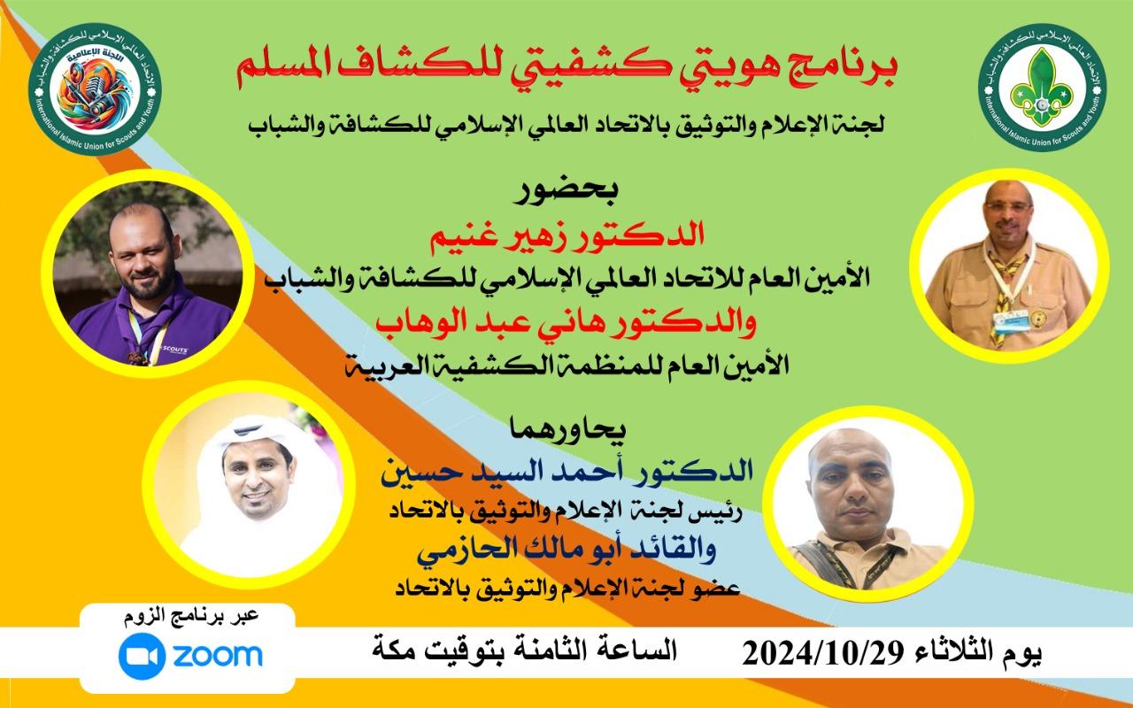 و يعد ھذا اللقاء حدثا فريدا و فرصة للحوار المباشر والنقاش حول الأنشطة الكشفية وتطورها في العالم العربي والإسلامي، كما سيتم تسليط الضوء على المبادرات والتحديات التي تواجهها الحركة والإسلامية البرنامج عبر منصة زوم يوم غدا الثلاثاء الساعة الثامنة مساء بتوقيت مكة المكرمة بحضور الامين العام للاتحاد العالمى الإسلامى للكشافة و الشباب الدكتور زھير حسين غنيم البرنامج من تقديم الدكتور أحمد السيد رئيس لجنة الإعلام والتوثيق بالاتحاد العالمى الإسلامى للكشافة و الشباب والقائد عبد الحكيم الحازمى عضو لجنة الإعلام والاتصال والتوثيق بالاتحاد العالمى الإسلامى للكشافة والشباب كونوا معنا فى ھذا الحدث الھام.