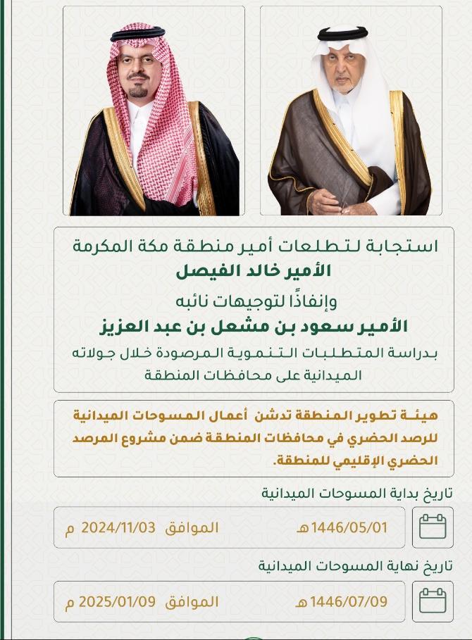 إستجابةً لتطلعات مستشار خادم الحرمين الشريفين أمير منطقة مكة المكرمة رئيس مجلس هيئة تطوير المنطقة صاحب السمو الملكي الأمير خالد الفيصل، وإنفاذًا لتوجيهات سمو نائبه صاحب السمو الملكي الأمير سعود بن مشعل بن عبدالعزيز، بدراسة المتطلبات التنموية المرصودة خلال جولاته الميدانية على محافظات المنطقة.