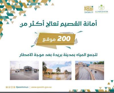 وأعلنت الأمانة أنها تمكنت من معالجة أكثر من 200 موقع لتجمع المياه في مدينة بريدة، مستخدمةً أكثر من 134 آلية ومعدة، بمشاركة 414 من القوى العاملة، حيث أسفرت هذه الجهود عن سحب 21,324 م3 من المياه عبر سيارات الشفط المتخصصة.