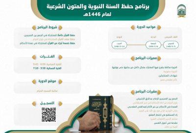 أوضحت رئاسة الشؤون الدينية بالمسجد الحرام والمسجد النبوي عن فتح باب التسجيل في برنامج حفظ السنة النبوية والمتون الشرعية، الذي سيُنفَّذ في المسجد الحرام خلال إجازة الفصل الدراسي الأول لعام ١٤٤٦هـ.