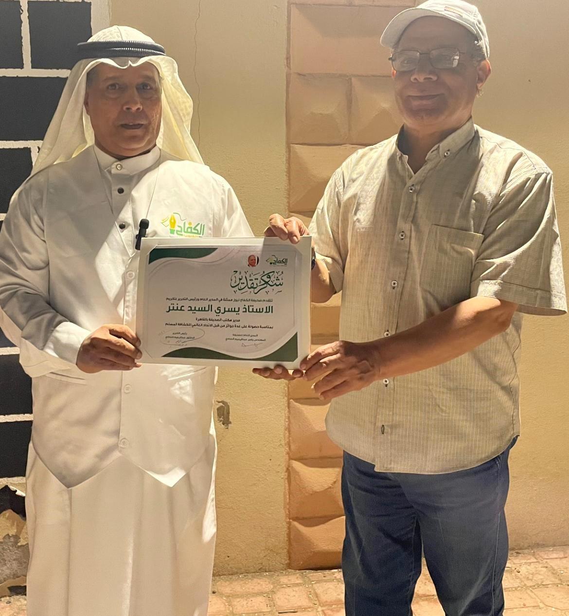 كرمت صحيفة الكفاح نيوز السيد يسري محمد عنتر مدير مكتب الصحيفة في القاهرة بمناسبة حصوله على عدة جوائز من الاتحاد العالمي للكشاف المسلم جاء هذا التكريم يوم أمس الأول بعد أن أدّى مناسك العمرة وزيارته للمدينة حيث قدم رئيس التحرير الدكتور عبدالرحيم الحدادي شهادة شكر وتقدير لعنتر.