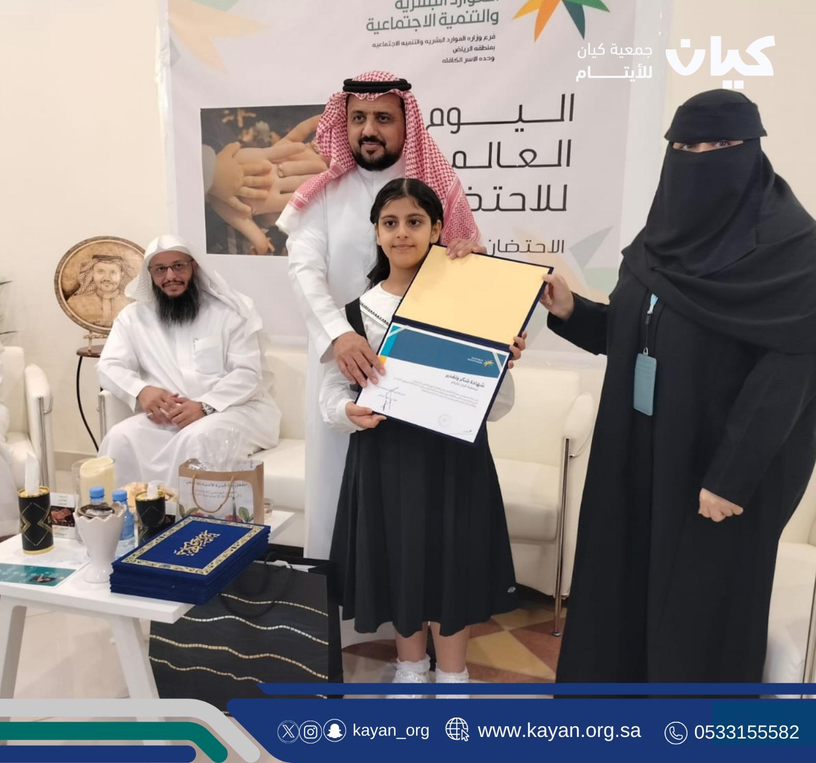 كذلك حظي الركن بزيارة عدد كبير من المهتمين والمهتمات وأعجبوا بقدرات الجمعية وتميزها في البرامج والإنجازات. هذا وقد حضر من جمعية كيان الأخصائية الاجتماعية أفنان الحربي والأستاذة منى عبد الله، وشاركت بالحضور الأم الحاضنة أم ضي وابنتها، كما شاركت الابنة لطيفة محمد بلوحة رسم عبرت فيها عن هذه المناسبة، وتم توزيعها مع باقات الورد على الحضور، وفي الختام تم تكريم جمعية كيان بشهادة شكر وتقدير لمشاركتها الفاعلة في تفعيل الاحتفال باليوم العالمي للاحتضان.