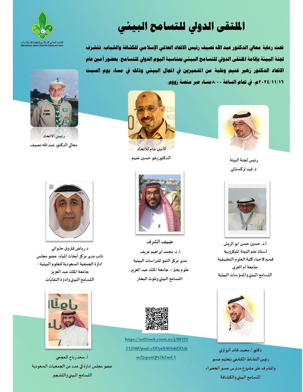 تحت رعاية معالي الدكتور عبدالله نصيف رئيس الاتحاد العالمي الإسلامي للكشافة والشباب … أقيم الملتقى الدولي للتسامح البيئي وذلك بمناسبة اليوم الدولي للتسامح، والذي نظمته لجنة البيئة بالاتحاد وبحضور أمين عام الاتحاد الدكتور زهير بن حسين غنيم ونخبة من المتميزين في المجال البيئي وذلك مساء السبت 16/11/2024 عبر منصة زووم.