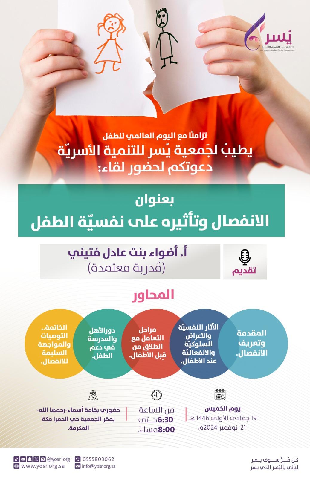 ضمن الأنشطة والبرامج والفعاليات والمبادرات التي تقوم بها جمعية يسر للتنمية الأسرية بمكة المكرمة وتزامنًا مع اليوم العالمي للطفل نظمت الجمعية لقاء: بعنوان (الانفصال وتأثيره على نفسيّة الطفل).