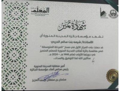 باركت الأستاذة – مريم سعد الدين – للمعلمة شيمة سالم درويش السحيمي على حصولها على المركز الأول على مستوى المدينة المنورة معلمة متميزة في المتوسطة السادسة والأربعون كما قدمت التهاني والتبريكات لتعليم المدينة لهذا الإنجاز وقيادة مديرة المدرسة نوال ذعار الرويثي لجهودهم في رفع بمستوي الطالبات والتعاون بين المدرسة والامهات.