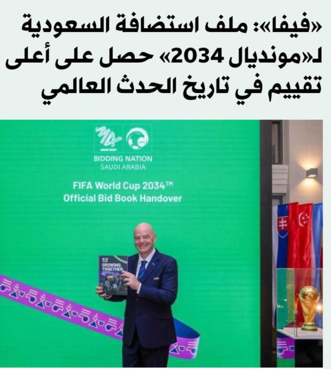 الف مبروك لكل السعوديين الفيفا يعلن بإن المملكة حازت على أعلى تقييم في تاريخ كأس العالم أكثر من 419 نقطة من 500 نقطة لإستضافة السعودية لكأس العالم 2034 وهو إنجاز سعودي جديد يجسد الدور الريادي والنقلة النوعية في جميع المجالات الذي تعيشه المملكة.