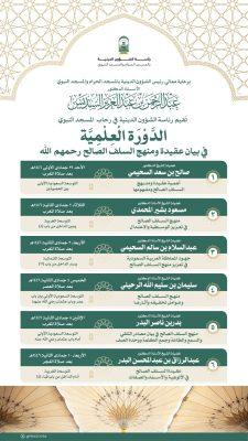 أعتمد معالي رئيس الشؤون الدينية بالمسجد الحرام والمسجد النبوي، الشيخ الدكتور عبدالرحمن السديس إطلاق الدورة العلمية الأولى بالمسجد النبوي بعنوان “عقيدة السلف الصالح ومنهجهم وجهود المملكة العربية السعودية في تحقيقه”، بمشاركة نخبة من أصحاب الفضيلة العلماء والمدرسين في المسجد النبوي.