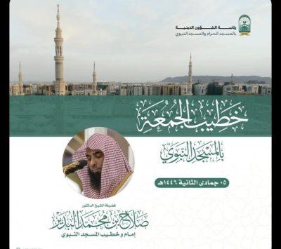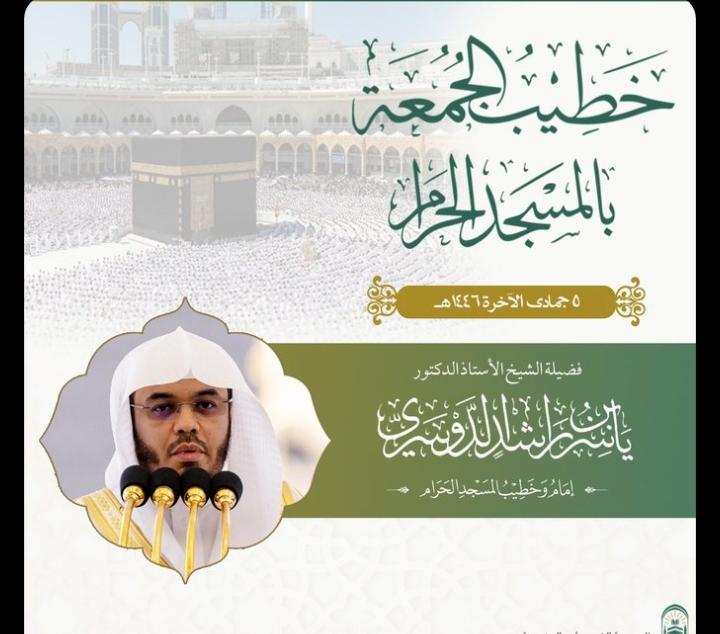 حددت رئاسة الشؤون الدينية بالمسجد الحرام والمسجد النبوي خطيبا يوم بعد غد الجمعة الخامس من شهر جمادى الآخرة – حيث سيكون خطيب الجمعة بالمسجد الحرام فضيلة الشيخ الاستاذ الدكتور ياسر بن راشد الدوسري بينما سيكون خطيب الجمعة بالمسجد النبوي الشريف فضيلة الشيخ الدكتور صلاح البدير.