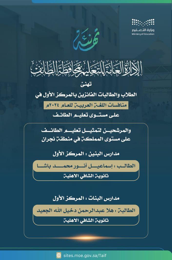 ويمثل تعليم الطائف في منافسات المرحلة القادمة الطالب إسماعيل أنور باشا، والطالبة هلا عبد الرحمن الجعيد، الحاصلان على المركز الأول على مستوى الإدارة، ًوالمتأهلان لخوض المنافسة على مستوى الوطن في منطقة نجران، وتشمل المسابقة مواد اللغة العربية وفنونها ” النحو والصرف، البلاغة، الإملاء، علامات الترقيم، الفهم القرائي، المهارة الإلقاء، والفنون الأدبية”.