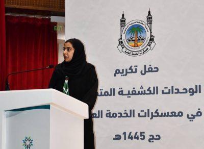 كما القت سمو الأميرة سما بنت فيصل كلمة بالمناسبة أكدت فيها أن الشباب هم عماد مستقبل الوطن، وأن الجمعية تعمل على رفع مستوى الوعي لدى الفتية والشباب بأهمية العمل التطوعي، لما له من فوائد عظيمة على الفرد والمجتمع، وذكرت أن مشاركة فتيات الكشافة في خدمة الحجاج توسعت ونمت فبعد أن كانت في موسم حج 1443هـ 35 فتاة فقط، ارتفع العدد في موسم الحج الماضي إلى 250 فتاة تشرفن بخدمة ضيوف الرحمن، وأشارت إلى أهمية اكتساب المهارات واكتشاف القدرات واستثمار طاقات الشباب وتوجيهها التوجيه السليم بما يخدم ذواتهم ويخدم مجتمعهم ووطنهم، واختتمت كلمتها بمقولة لخادم الحرمين الشريفين الملك سلمان بن عبدالعزيز -حفظه الله- :” العمل الخيري هو من ركائز المجتمع و هو من أساس ما يمليه علينا ديننا و التراحم بين أفراد المجتمع لن يأتي إلا بالخير”.