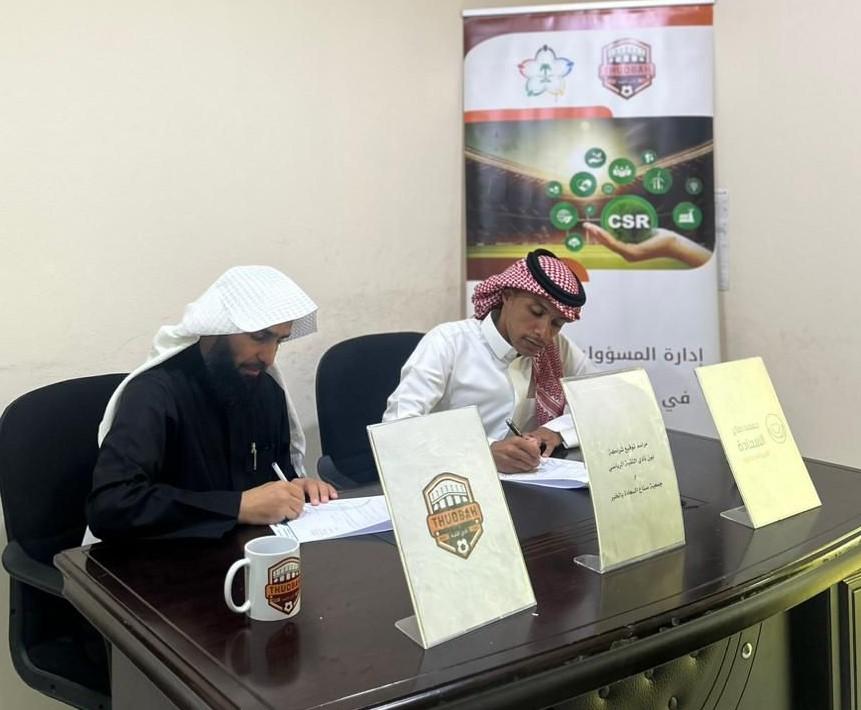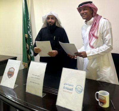 مثّل نادي الثقبة رئيس مجلس الإدارة أ. الوليد الصياح و مثّل جمعية صناع السعادة رئيس مجلس الإدارة د. ياسر آل داشل بحضور أ. علي الخشرمي عضو مجلس إدارة جمعية صناع السعادة ومدير المسؤولية المجتمعية في نادي الثقبة أ.عائشة الناجم وذلك بهدف تعزيز العمل المشترك والأنشطة والمبادرات المجتمعية بين الجهتين.