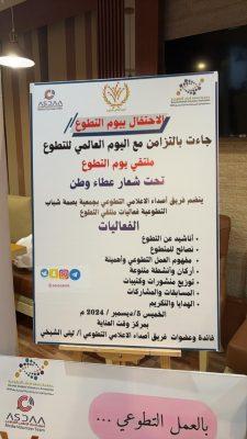 نظَّم فريق أصداء الإعلامي التطوعي بجمعيّة بصمْة شباب التطوعيّة بالقنفذة بقيادة الإعلاميّة الأستاذة ليلى الشيخي ملتقي يوم التطوع بالتزامن مع اليوم العالمي للتطوع الذي يصادَّف 5ديسمبر من كل عام حيث أقيّم الملتقي مساء الخميس في القنفذة.