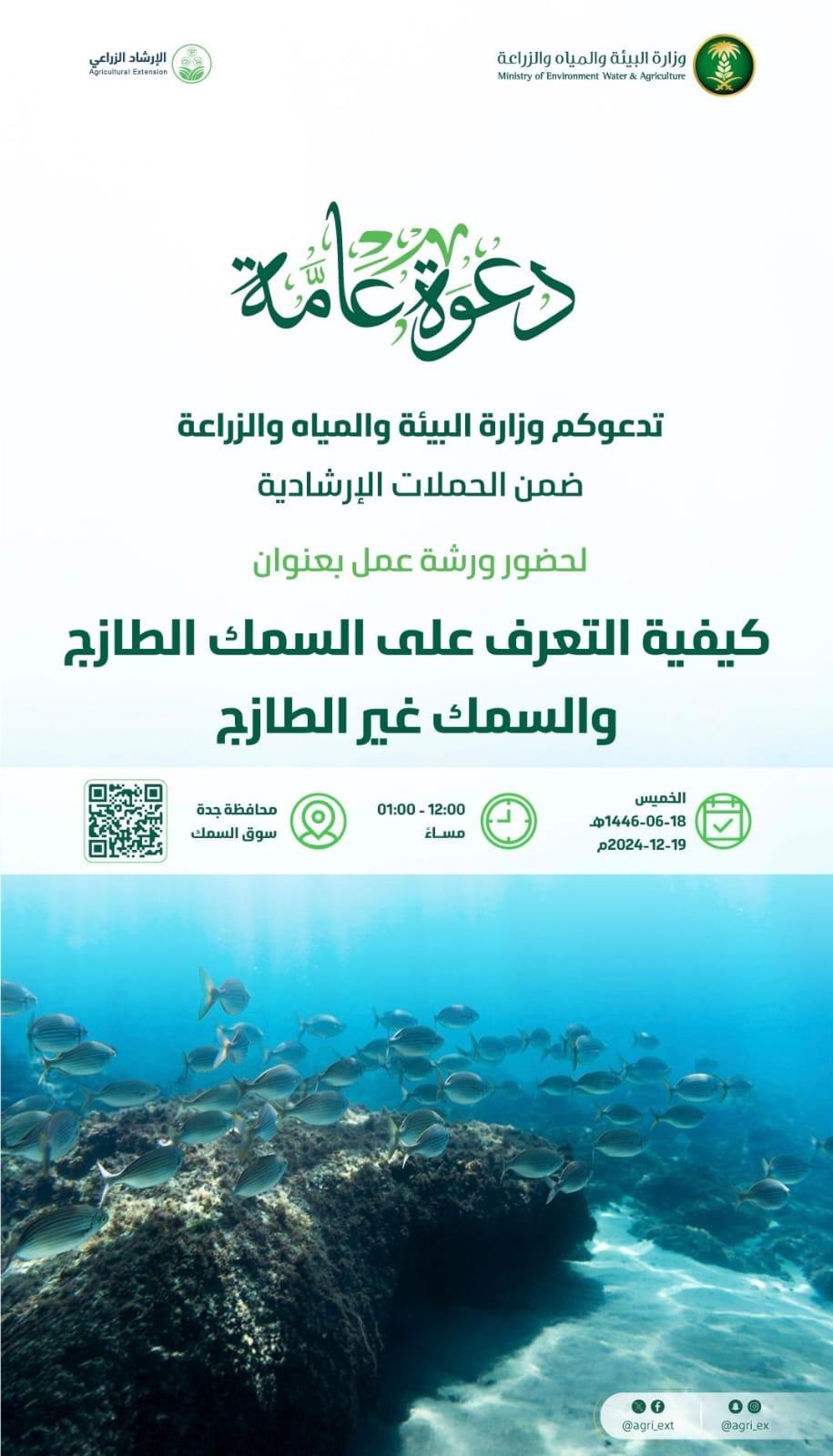 وأضاف الخليف أن هذه الورش هي نتائج التعاون والتنسيق المشترك بين إدارة الإرشاد الزراعي بالوزارة وادرة الزراعة بالفرع ومكاتب الوزارة بمحافظات منطقة مكة المكرمة ؛ مؤكدا أن الإرشاد الزراعي ركن أساسي في دعم وتطوير العملية الزراعية، ورفع الكفاءة الإنتاجية والاقتصادية للمنتجات الزراعية، وتوجيه المزارعين للوصول إلى تحقيق كفاءة الإنتاج ؛ موضحا أن الحملة ستختتم اعمالها هذا العام عن طريق تنفيذ ٩ ورش في محافظات جدة وخليص والجموم ؛ وستستمر على مدار ٣ أيام متتالية خلال الفترة المسائية وبواقع ساعتين الى ثلاث ساعات يوميًا ؛ حيث سيقام يوم الخميس القادم بمحافظه جده بسوق السمك المركزي ورشتين الأولى بعنوان كيفيه التعرف على السمك الطازج والسمك الغير طازج والورشة الثانية ستكون عن أنواع الأسماك البحرية وقيمتها الغذائية.