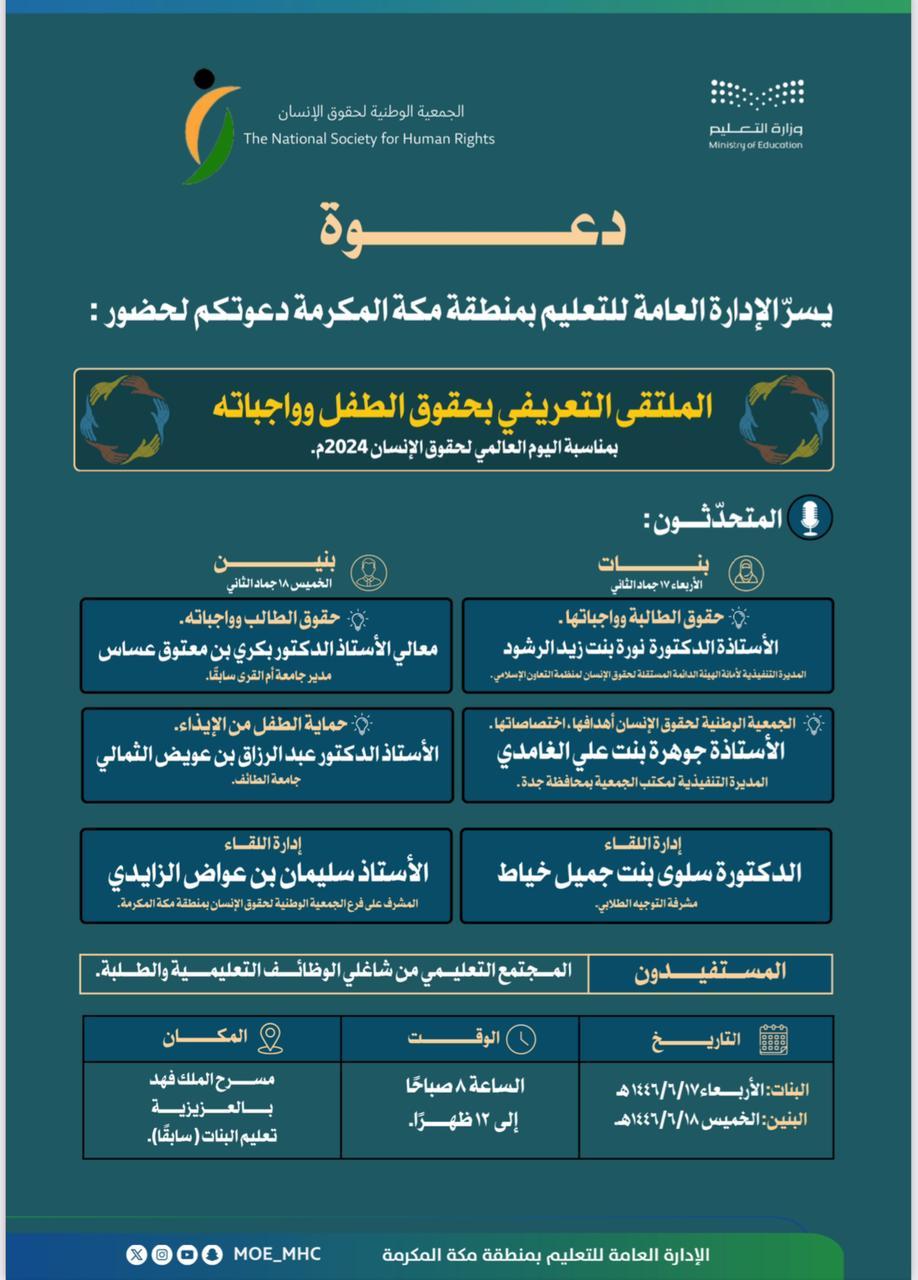 انطلقت في الإدارة العامة للتعليم بمنطقة مكة المكرمة اللقاء التعريفي بحقوق الطفل وواجباته وذلك تزامناً مع اليوم العالمي لحقوق الإنسان وتستهدف الإدارة في الملتقى على مدى يومين 3000 آلاف طالب وطالبة من مدارس التعليم العام بمكة المكرمة وشاركت في يومه الأول اليوم الأربعاء الأستاذة الدكتورة نورة بنت زيد الرشود المديرة التنفيذية لأمانة الهيئة الدائمة المستقلة لحقوق الإنسان لمنظمة التعاون الإسلامي بمحور “حقوق الطالبة وواجباتها”.