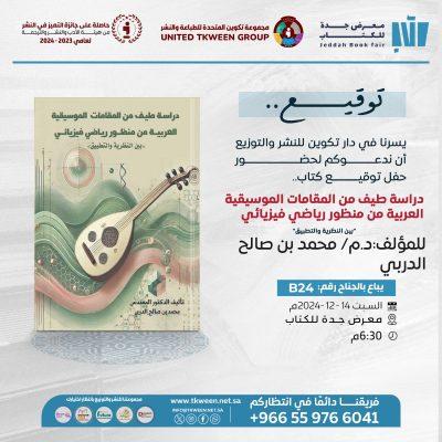 أصدر البروفيسور مهندس محمد صالح الدربي أحد أبرز مثقفي وأساتذة الهندسة الميكانيكية الفيزيائية والرياضية من خريجيي جامعة إمبريال كولج ببريطانيا المبدعين وخريج جامعة الملك فهد للبترول والمعادن قبل ذلك: كتاباً هو الأول من نوعه بالعالم العربي كونه يجمع بين علوم الرياضيات والفيزياء دعماً وتحليلاً مع المقامات الموسيقية! في منهج قادر على افراز إبداع حقيقي يوازي رعايته للمبدعين بعينه الصادقة وساعده المضيء و دشن كتابه بمعرض الكتاب الدولي بجدة للكتاب الذي عنوانه: “دراسة طيف من المقامات الموسيقية العربية من منظور رياضي وفيزيائي”: فلاقى إقبالاً حاشداً من مختصي ومهتمي هذا المنهج من العلم الذين كان ظل يحاورهم بشموخ علمي ثقافي ويستقطر لأسئلتهم من حكمة خبراته وقدراته المرتوية من واقعه الفكري العلمي!.