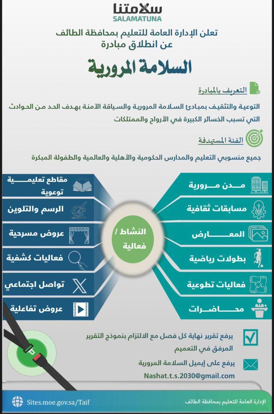 أوضحت الإدارة العامة للتعليم بمحافظة الطائف عن انطلاق مبادرة “السلامة المرورية”، التي تسعى إلى تعزيز الوعي والتثقيف بالسلامة المرورية والقيادة الآمنة، للحد من الحوادث المرورية والخسائر الكبيرة في الأرواح والممتلكات.