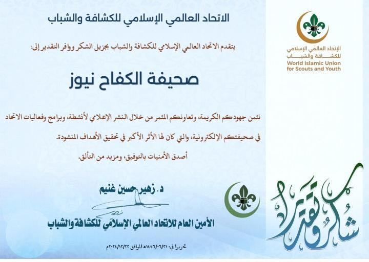 تم تكريم صحيفة الكفاح نيوز من قبل الإتحاد العالمي الإسلامي للكشافة والشباب لتعاونها المثمر من خلال النشر الإعلامي لأنشطة وبرامج وفعاليات الإتحاد العالمي الإسلامي للكشافة والشباب.