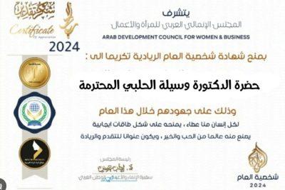 حصلت الدكتورة وسيلة محمود الحلبي سفيرة الإعلام العربي على تكريم رفيع وإختيارها (شخصية العام الريادية 2024) وشهادة شكر وتقدير، حيث كرمتها الدكتورة إيمان الغصن رئيسة المجلس الإنمائي العربي للمرأة والأعمال وسفيرة الإنماء والأعمال بالوطن العربي وذلك على جهودها وطاقاتها الإيجابية المبذولة لصناعة عالما مليئا بالخير والمحبة داعية لها بالتوفيق والتميز الدائم.
