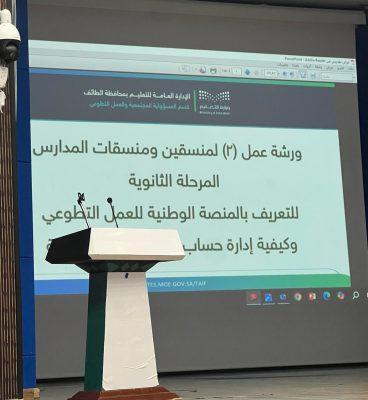 نفذت الإدارة العامة للتعليم بمحافظة الطائف صباح اليوم الثلاثاء ورشة تدريبية لمنسقي ومنسقات العمل التطوعي بمدارس المرحلة الثانوية لتدريبهم على كيفية إدارة التطوع في حساباتهم في الجهة-مدارس الإدارة العامة بالتعليم بمحافظة الطائف- في المنصة الوطنية للعمل التطوعي، وذلك استكمالاً لجهود إدارة التعليم في هذا الشأن ممثلةً في قسم الخدمة المجتمعية والعمل التطوعي بالإدارة، على مسرح الإدارة بالفيصلية.