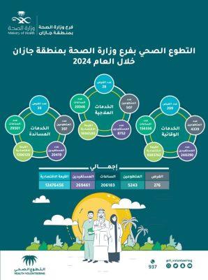 تفذ التطوع الصحي بفرع وزارة الصحة بجازان خلال هذا العام 2024 م ، اكثر من 206183 ساعة تطوعية شملت الخدمات العلاجية والوقائية والخدمات المساندة شملت مختلف مراكز ومحافظات منطقة جازان.