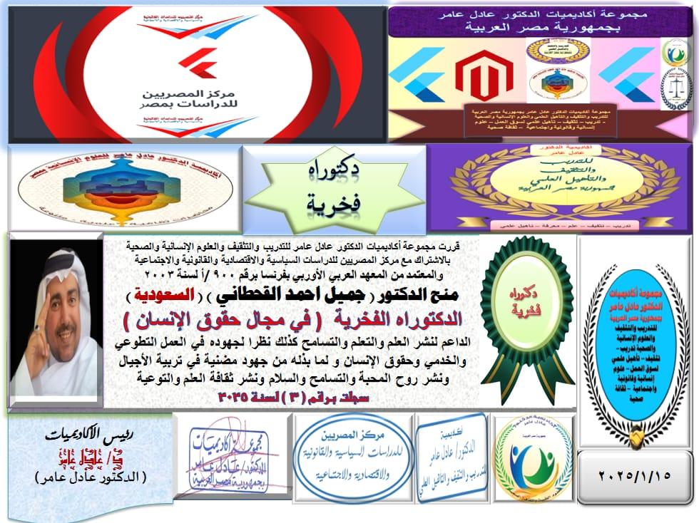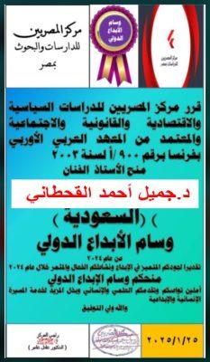 منح الفنان والمخرج السعودي د. جميل القحطاني وسام الابداع الدولي والدكتوراه الفخرية وذلك من مركز المصريين للدراسات السياسية والاقتصادية والقانونية والاجتماعية والمعتمد من المعهد العربي الاوربي بفرنسا تقديرٱ لجهوده المتميزة في الابداع ونشاطه الفعال والمثمر خلال عام 2024.