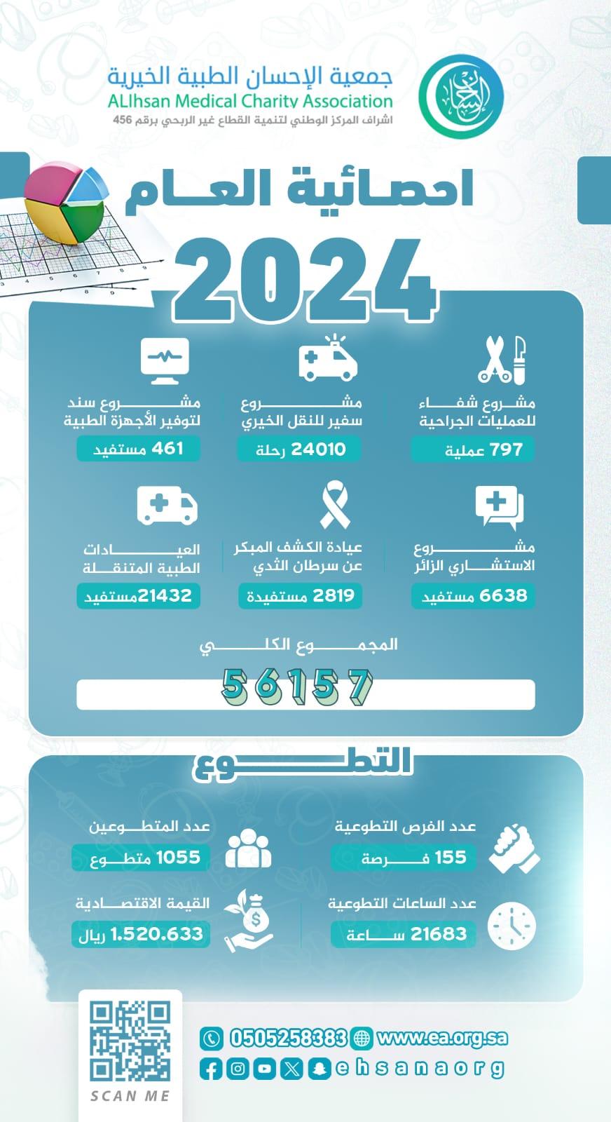 قدمت جمعية الإحسان الطبية الخيرية بمنطقة جازان خدماتها العلاجية والتثقيفية خلال العام 2024م لـ 56157 مستفيدًا ومستفيدة من مشاريع ومبادرات الجمعية الطبية والتوعوية المختلفة.