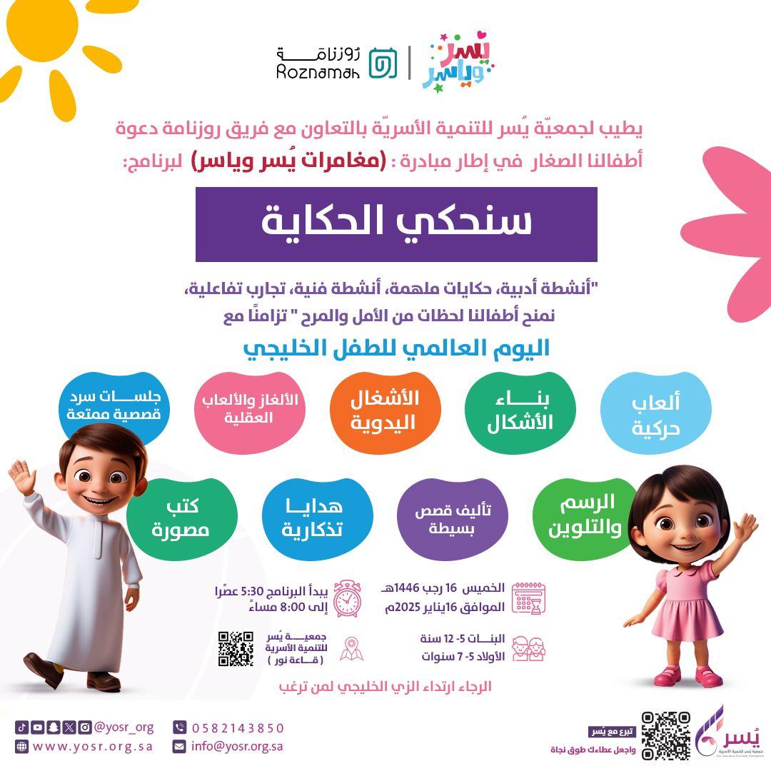 ضمن الأنشطة والبرامج والفعاليات والمبادرات التي تقوم بها جمعيّة يُسر للتنمية الأسريّة بمكة المكرمة تقيم الجمعية وبالتعاون مع فريق روزنامة مبادرة للأطفال الصغار وذلك في إطار مبادرة : (مغامرات يُسر وياسر) لبرنامج:(سنحكي الحكاية) وتتضمن المبادرة “أنشطة أدبية، حكايات ملهمة، أنشطة فنية، تجارب تفاعلية، نمنح أطفالنا لحظات من الأمل والمرح “.
