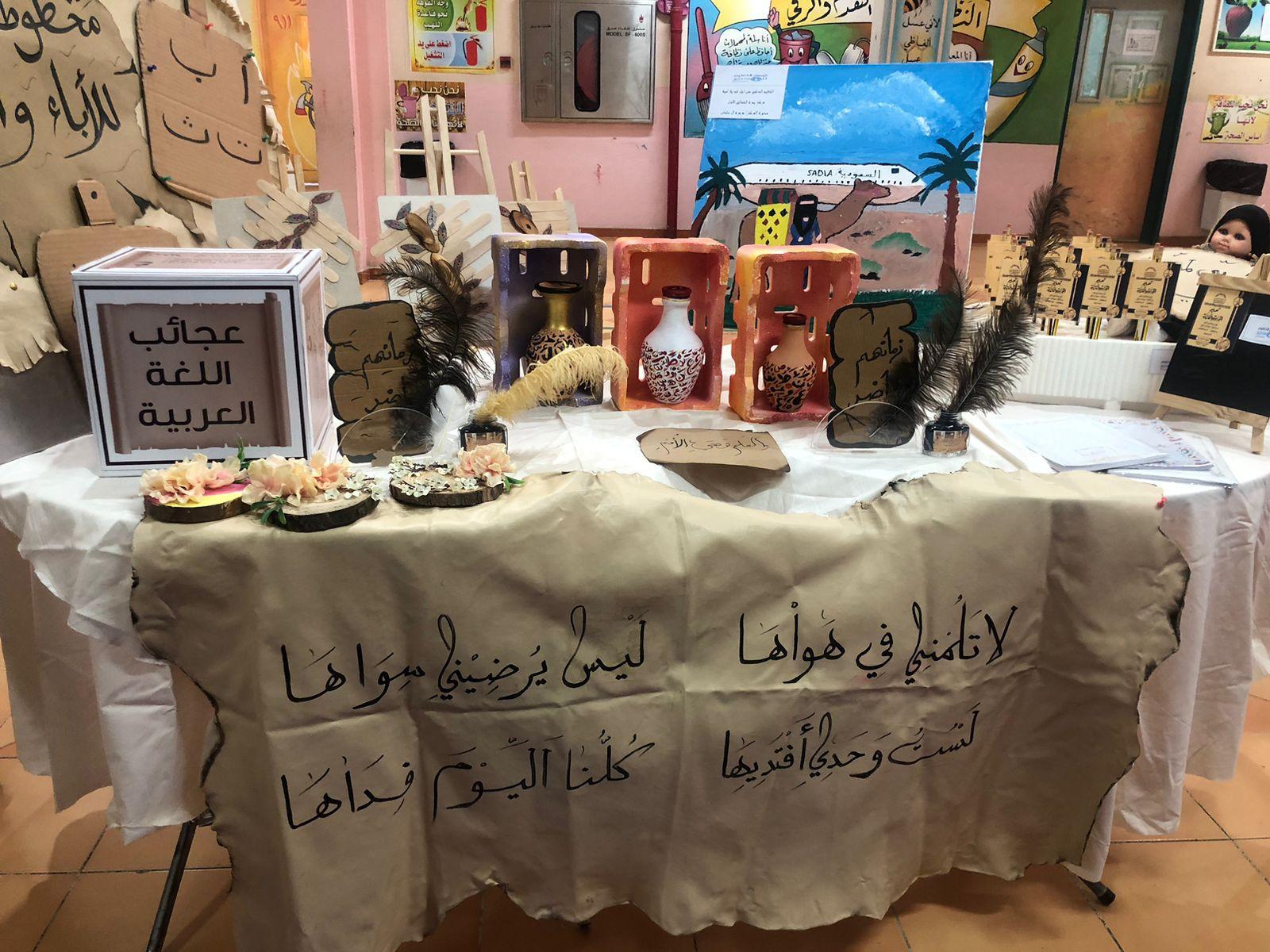 وفي السياق نفسه جرى استعرض أبرز منجزات ومبادرات القسم تحت شعار ( التعليم الذكي من أجل غد بلا أمية ) فيما تضمن الاحتفاء معرض مصاحب يحوي عددًا من المنتجات واللوحات من أعمال الدارسين والدارسات، من برامج ومبادرات تدعم العملية التعليمية ومهارات وحرف ومهن وصناعات يدوية وخياطة ورسوم وطنية، لتعزيز الانتماء الوطني.