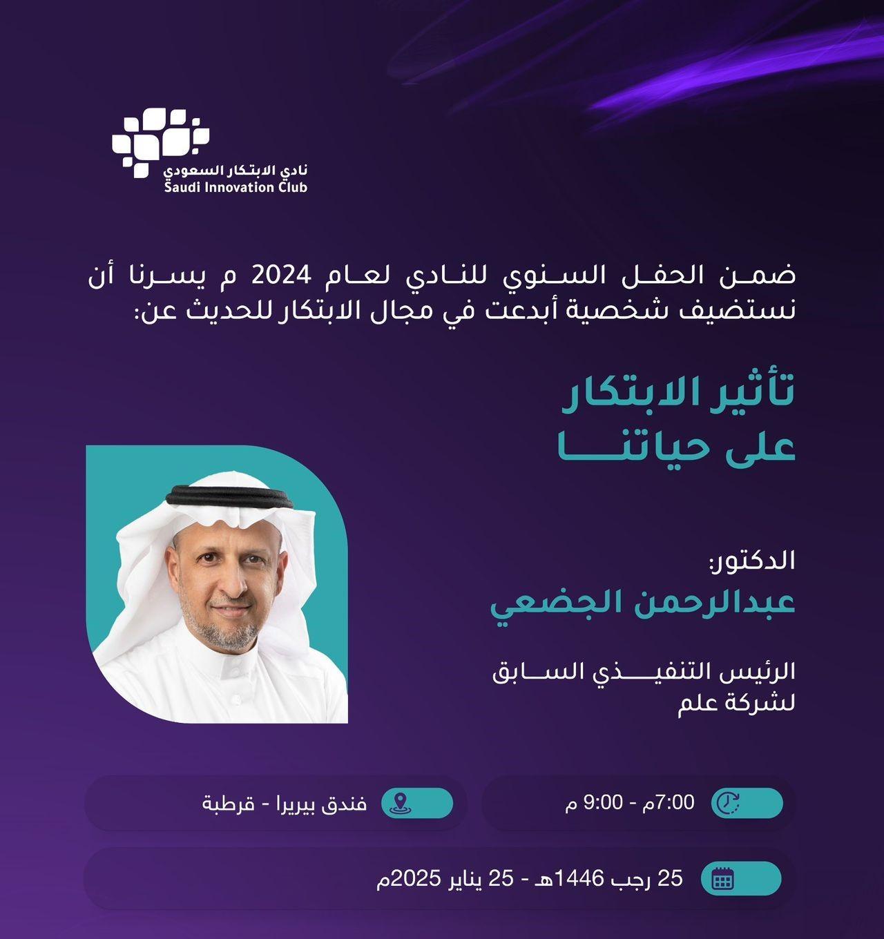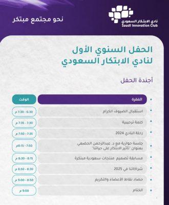 أقام نادي الابتكار السعودي الحفل السنوي الأول في العاصمة الرياض مساء أمس السبت الموافق ٢٥ يناير حيث أفاد رئيس النادي المهندس ماجد محمد عنيزان الخبير في مجال تقنية المعلومات وتطوير الأعمال بأن هذا الحفل السنوي الأول يتم التأكيد فيه على أن رسالة النادي تعمل وفق رؤية المملكة ٢٠٣٠ من أجل مجتمع مبتكر ؛ وتضمن أجندة تناولت رحلة النادي خلال عام ٢٠٢٤م ؛ وجلسة حوارية تحدثت عن ( تأثير الابتكار على حياتنا) باستضافة مميزة لشخصية أبدعت في مجال الابتكار الدكتور عبدالرحمن الجضعي الرئيس التنفيذي السابق.